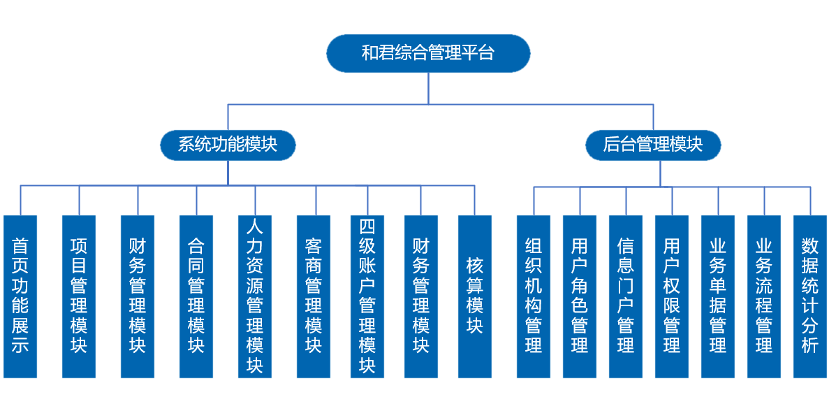 通过和君集团业务财务一体化平台的建设,实现集中核算、财务管理、报销管理、合同管理、销售管理、人力资源、统计查询、项目管理功能的集团管控;实时掌握项目与合同的签订情况,实现集团各部门对各个团队营业情况的实时统计。
