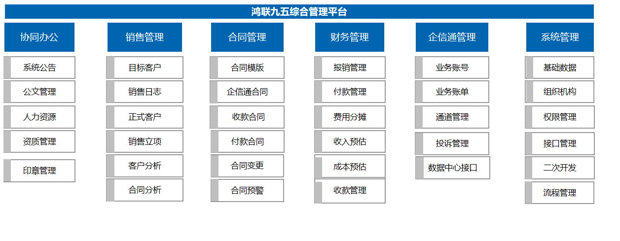缺少统一的销售管理、合同管理和财务管理系统,即能适应鸿联九五集团整体管理要求,并同时支撑三大主营业务,解决客户数据无法有效共享、业务协同受限、业务与财务数据不一致的问题,从而支撑集团整体管控,适应各项业务快速发展。